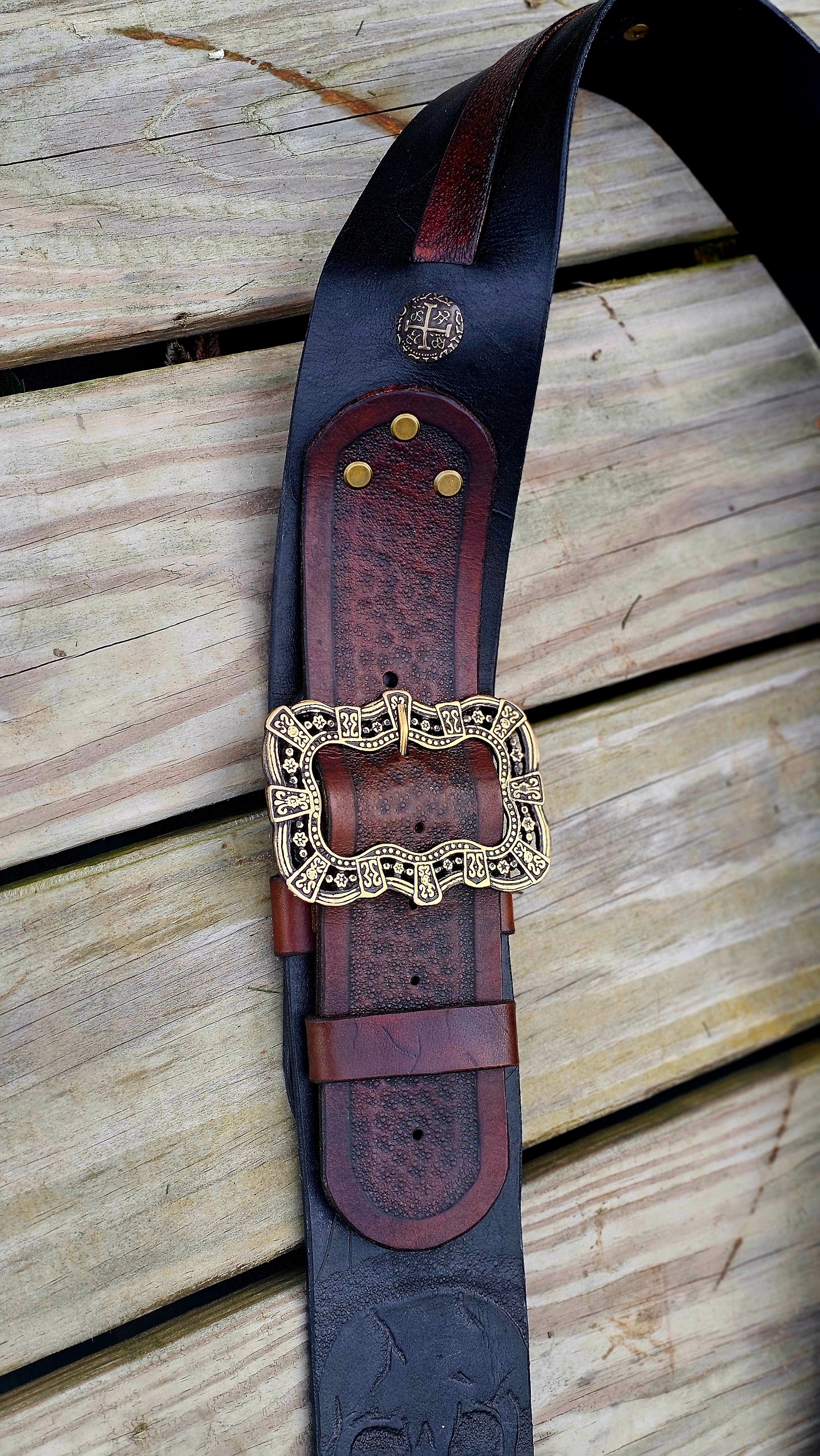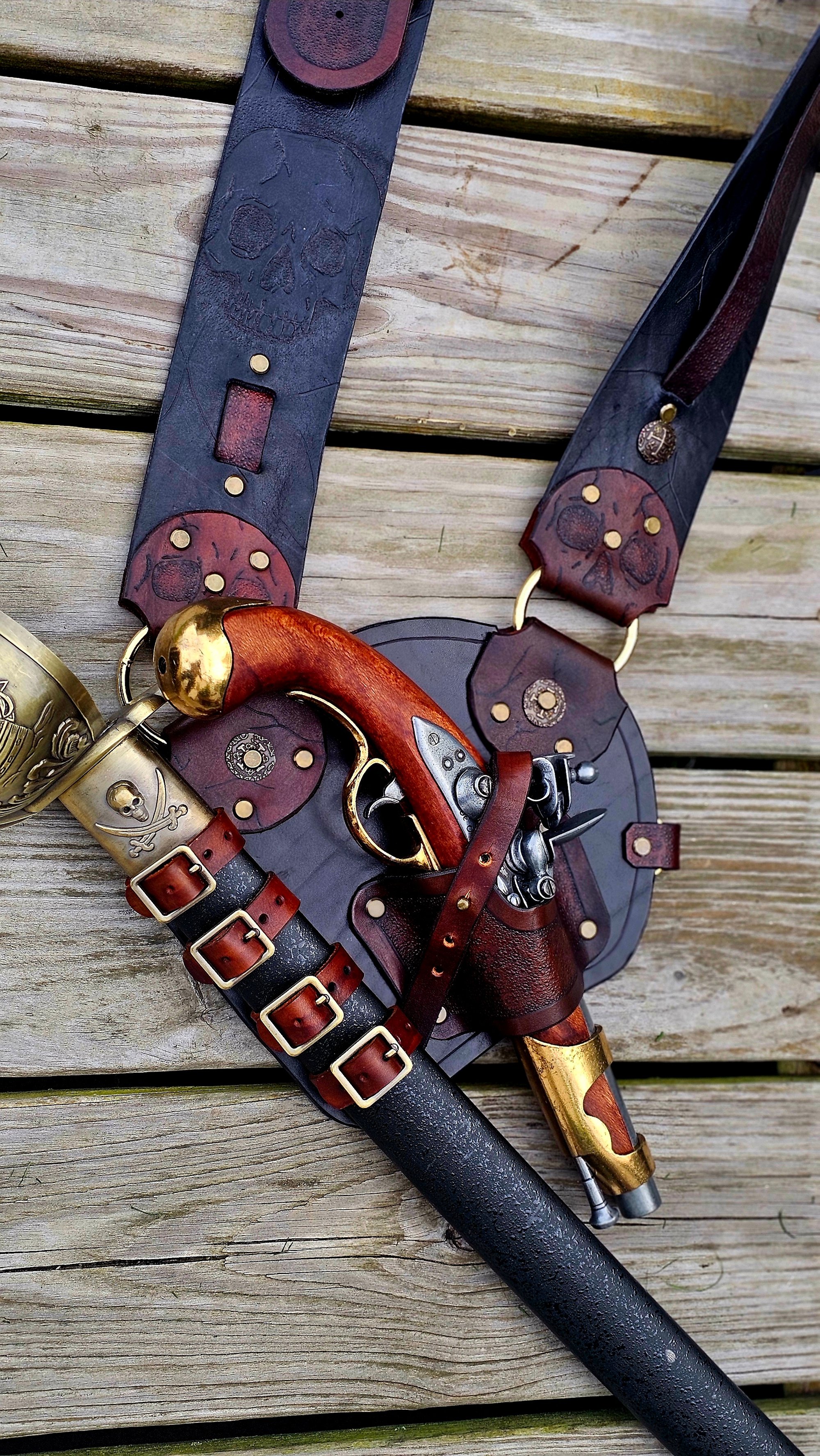 Handmade Leather Baldric, Black and Brown, Cursed gold. Skull carvings, Doubloons. Sword and pistol sold separately.