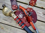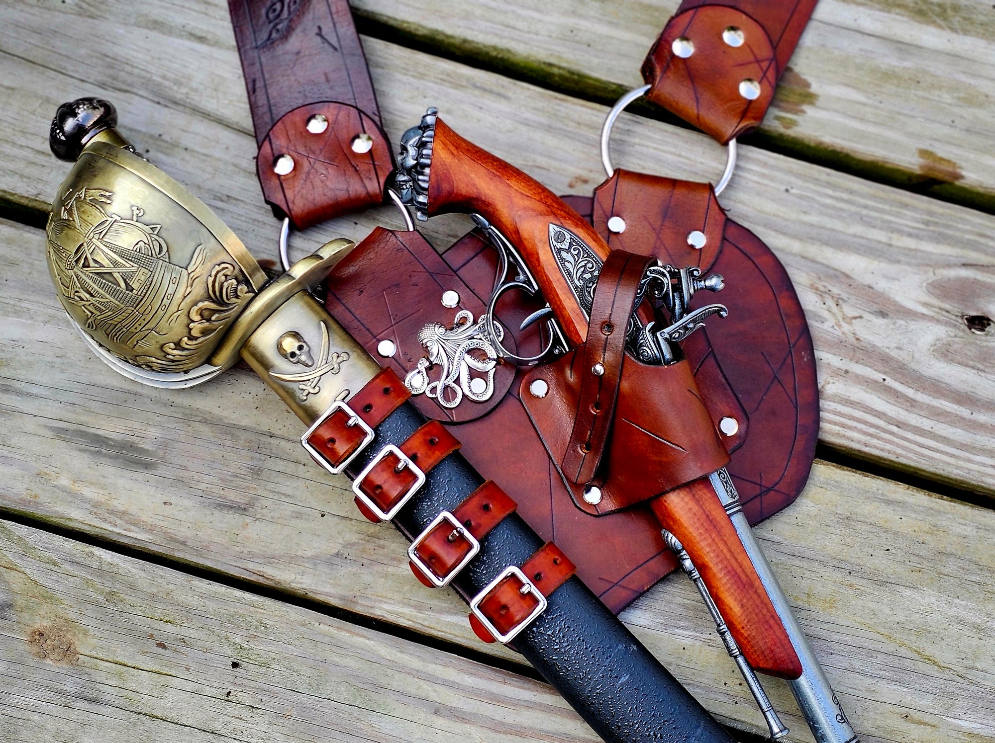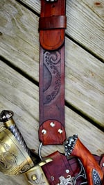 Hand tooled Leather baldric, 2.5" wide. Cutlass/pistol mount, cutlass and pistol not included.